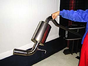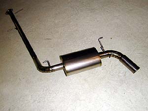 持ってびっくり。指でつまむ程度の力で持ち上がる。重量は実測で約3Kg強らしい。ノーマルマフラを測ってみたら10.5Kg、社外品のJASMA認定スチールマフラが13Kgくらい。普通のスチール製スポーツマフラに比べて10Kgの軽量化!! これで良い音がするなら欲しいぞっ。...で、コレがすっごく良い音がするんですよ(^^;。N1マフラ系の音。コーンズの音をちょいと汚くしたような感じ(笑)。こもる音じゃないし、ARCのチタンマフラみたいに妙に静かって事もなくて丁度良い音量。これ、すっごく欲しいです。15万8000円かー。私はビンボーなんで買えねぇなぁ。