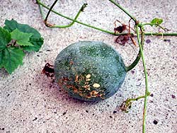 これは一体??????? ナニ?(^^;;;;;君はツタじゃないのか? そーいえばしばらく前に小さな白い花が咲いてたっけ。長径80mm、短径50mmくらいの楕円形で硬い物体。ツタってこんなデカイ実が出来るのか? コレは食えるのか? 良く見るとウチの玄関先だけで3つくらい転がってる。葉っぱのカタチを見ると他の壁面に繁ってるツタとは微妙に違うような気もするのだが、この物体が付いている枝葉を追っかけて行くとツタの中に紛れ込んでわけわからん。ツタのような気もするしツタじゃないような気も...。他の壁面のツタには身は付いてないような気もするし...。友人Tはこの実を目撃して死にそうなくらい笑ってたし。 そろそろ収穫して輪切りにしてみようかなぁ。