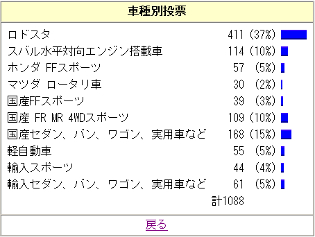1000件を超える回答で偏りの無いほぼ正確なデータが得られたのではなかろうか? 各車の順位はほぼ予想通り。が、スバル車の多さは予想以上かな。スバルが多いのは予想してたけど読者の10%にも達するとは思わなかった。今後はスバルネタも増やしていこうかな?(笑)。 ロータリやホンダスポーツの多さも予想通り。軽自動車の少なさは意外。ロドスタ+軽自動車ってパターンの2台所有が多いかと思ったが、そうでもないのか? 輸入車が軽より多いってはちょっとビックリ。