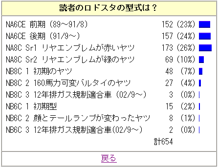 アンケートコーナを作ってみました。読者の皆さんが一体どんなクルマに乗ってるのか? ロドスタ以外の読者はどれくらいいるの? ロドスタの型式分布は? そんな素朴な疑問を投げかけてみました。皆さんの協力をお願いしたいと思うわけです。