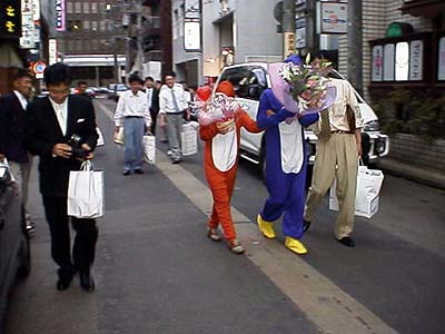白昼の繁華街を歩くペンギンとバブルス。こいつらが新郎新婦。恥ずかしさのあまりに花束で顔を隠しているが実は結構ノリノリ。このあとしばらくしてからは堂々と歩いていた。見知らぬ人々に手を振りながら愛敬を振りまいていた二人だった。ちなみにこのペンギンは身長180cm以上あるジャンボペンギン。だが足の長さは30cmくらいしかない。超小刻みな歩き方がステキ。面白すぎるぞ>M橋