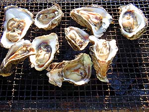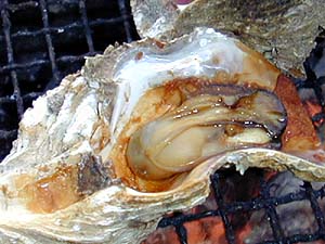 ぐふふ。カキをぶち割ってダイレクトに焼く。味付けはもちろん片上醤油で決まり! はた氏の為にアップにするとこうなる↓。