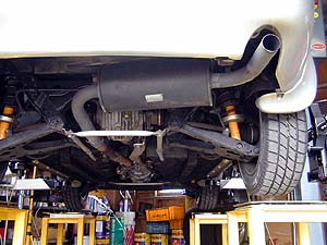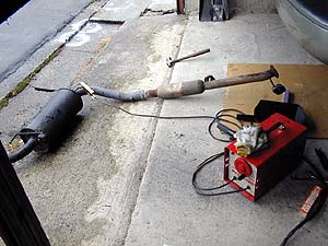 ↑マフラー製作中。電気溶接機でバリバリと溶接。後ろ半分は松田速度のホモロゲ切れN1マフラー、前半分は腐ったセブリングマフラのセンタパイプである。"納屋"とも言われてしまう(笑)私のガレージには電気溶接機が完備されているのだ。仮組して位置を合わせた状態で点付け溶接をして、もいちど外してから本格的に溶接する。んで、もう一度付ける。完璧。