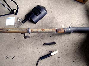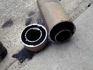んで、ガレージの傍で拾った現場のパイプ(笑)を繋ぐ。 腐り具合が拾ったセブリングマフラのパイプと見事にマッチしている。微妙な曲がりを付けたのがミソ。これで定位置にピッタリと付くのだ。
