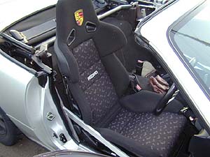 もうひとつ大きな問題。それは椅子。やっぱ辛いのよ。コーナを抜けたあとでケツの位置を直す為に座り直してる自分が悲しい。そこで、友人のポルシェの助手席に付いてた椅子を奪い取ってきた。ベースフレームは某ショップに落ちてたのを借りた。付けてみました。