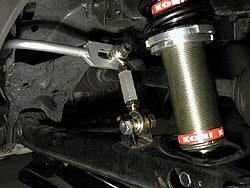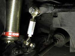 調整式スタビライザとピロボールリンクも導入。この写真ではφ12mmスタビだが、その後φ11mmで調整幅を更に拡大したモノに変更。リヤスタビを柔らかく設定してリヤサスの接地性を確保。マフラは去年の自作φ48mmから松田速度快音φ50.8mmに変更。