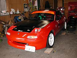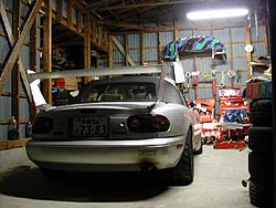 友人T号NBエンジン0.5mmオーバサイズのファインチューン仕様。今年は4連スロットル+Freedom仕様ながら、まったくセッティングが出てない状態。ヘタすりゃノーマルシステムの方が速いのでは?(^^; 足は私のと同じ KONI ASA HALF SPECIAL を新調。バネは12K-10Kだ。ファイナルギヤは4.300に変更。カーボンボンネット、超大型ウイングを装着。去年はトップタイムだが今年はどこまでいける?