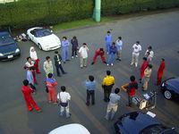 ドライバーズミーティング。最速タイムを狙うオヤジレーシング、「オヤジレーシングを叩きのめせ」と叫ぶ私。ドラミの時点ですでに激しい舌戦が繰り広げられる(笑)。