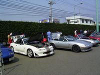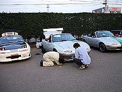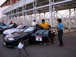 パドックに集まった25台のロドスタ達。腰がブローしたという大市民氏の腰を襲ってみたりする。激しく逃げる大市民氏。マジで腰ブローなの?(^^;
