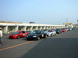 そして1本目の走行開始。朝一発目の8:00だ。まだ路面温度も低い。ゆっくりと隊列を組みながらスタートし、タイヤを温めるスラロームを繰り返す。怪しさ満点、どうみてもレースのローリングスタートだ。他の走行会の連中はどう思って見てただろうか?(^^;
