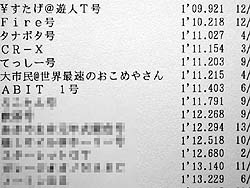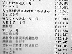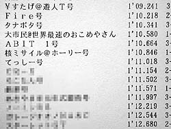 Fire号の後ろに張り付くタナボタ号。そこに大鋸屑を恐れてピットで待機してたABIT号がピットアウトしてきた。我々2台の目の前だ。これはおもしれぇ。ABIT号のテールに張り付く私とタナボタ号、コースインしてきたばかりでペースが上がらないABIT号を後ろから様子見していた私、そこを狙って1ヘアのインにタナボタ号が割り込んだ。タナボタ号に抜かれた私。後にも先にもこの走行会で抜かれたのはこれ1回。そのままの隊列で走って、2ヘアの入り口でABIT号のインにタナボタ号が割り込んだ。タナボタ号、ABIT号の前に出る。その後の1コーナで我々の目の前でスピンした車両があり、それをかわしたところで私はペースを落とした。このままABIT号に絡んでるとタイムが出ない。単独走行でタイム狙い(笑)。すこしは慣れた前方にABIT号とタナボタ号が見えている。アレに追い付くつもりで走ればタイムも出るだろう。そーいえばABIT号のFreedom不調は直ってるみたい。その後、ABIT号はなぜかバックストレートで大スピンして後方に消え去り、タナボタ号に再び追い付き始めたところでチェッカフラッグが出た。その結果はこれ↓。
