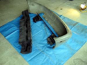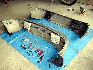 軽量化。リヤバンパーのレインフォースメントをカットして皮一枚にしてみた(笑)。黒いのがレインフォースメント。これを切って捨てた。真ん中はブラケット+リテーナ、右はバンパーの皮である。