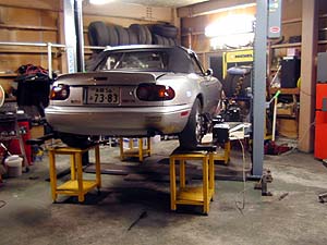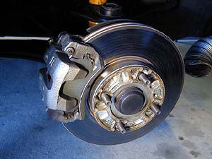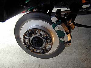 まずはブレーキをなんとかする。去年はノーマルブレーキパッドで走って大変だった。今年はブレーキ強化だ! リヤはすでにNB8Cのブレーキロータが付いている。フロントはどうしようかと思ったが、思い切ってNB8Cのロータ&キャリパに交換した。PバルブはNA8Cのモノを変造して1mmのワッシャを入れた。