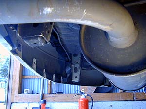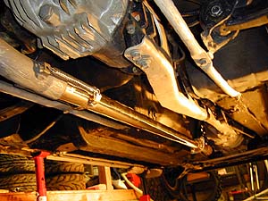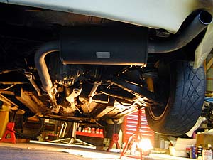 取り付け状態。かっこいいだろー。色がおかしいのはデジカメのホワイトバランス設定ミス。しかしなー、このフランジが折れたらクルマがジャンプするよなー。棒高跳び状態になるような気がするんだよなー。大丈夫かなぁ?(^^;