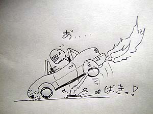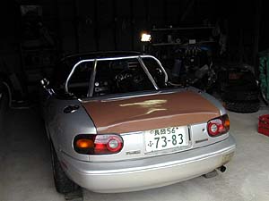 そして軽量化のトドメは茶太郎から借りたFRPトランクリッド。今回の長岡勢のテーマは「借り物トランクリッド」である。前出の友人T号のウイングの写真で茶太郎のトランクリッドがFire号のモノと入れ替わってる事に気付いたヒトは大したモンである(笑)。このトランクリッドだけで4〜5Kgの軽量化が可能。そしてドライバの仕上げとして10月14日に間瀬サーキットを走ってきた。間瀬は4速全開から2速までのブレーキングなど筑波と共通する部分が有るので練習には良いだろう。が、筑波のような高速コーナが無いので未だに高速コーナが苦手な長岡勢である(笑)。