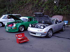 友人と一緒に間瀬のパドックにて。緑ガエル&銀ガエルだ。Fire号が履いてるタイヤは15inのアゼニスで195-55-15である。ちなみに全然グリップしない。この日の課題は強力無比になったブレーキを上手く生かせるかどうか。今までと同じつもりでブレーキングするとコーナの手前で止まる(笑)。ブレーキングから突っ込みのリズムが全然掴めないまま3本を走りきった。それでもナニも練習しないでぶっつけ本番で筑波に行くよりは良いだろう。