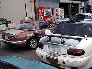 トランクリッドごと借りて来た巨大ウイング。このダウンフォースで筑波最終コーナを全開踏み切りで走る予定らしい(笑)。スライドし始めた瞬間に空力が乱れて一気にスピン&フェイドアウトする可能性もアリ。関係ないけど写真奥は茶太郎。ではFire号の筑波対策を紹介しよう。