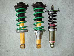 KONI-GPノーマル、GPの車高調アダプタ付き、ASA HALF SPESIALの3兄弟。ASAは超ショートケース&ショートロッド。これ、フルラップ式ではないものの、付属する3種類のカラーとピロカラーの組方を選択してロッド長を調整する事により、車高とイニシアルを別々にセッティング可能。具体的にはイニシアルゼロのままでフェンダの隙間が指1本入らないくらいから3本入るくらいまでの調整は可能だ。これはけっこナイス。