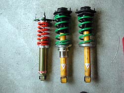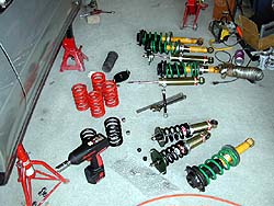 さて、問題のFire号はどうなってるのか?(^^; 入魂の新エンジンは加工屋の都合と私の都合で筑波に間に合わない事が盆前に判明。その時点であっさりと製作を諦めた(笑)。よってエンジンは2000年レストア企画の時に製作したエンジンのままだ。エンジン以外の部分でタイムアップを狙うならもう足しかない。なんせ友人T号と同じく6K-5.5Kという峠スペックのバネだったのだ。ダンパも車高調整とは言えノーマル形状のKONIだ。これではN1スペックの連中には勝てない。しかしノーマル形状KONIを使う以上、φ82mmのバネの呪縛から逃れられない。φ82mmの直巻きって手も有るが、ケースの長さとロッドの長さはどうにもならん。そしてついに買ってしまったのがコレ↓