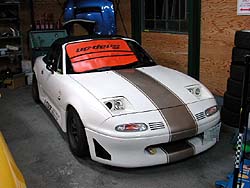 足はCORN'Sのフルラップ車高調整式でバネは10K-8Kだ。ブレンボのブレーキロータやらど〜だバーなども導入。タイヤは間瀬決戦の時まで使っていたYHの048を捨ててBSの540Sで15inだ。ホーリー号の最大の筑波対策は、間瀬決戦の時に86に特攻して凹んだフェンダとドアをそのままにしてある事。走行会とレースの区別が出来ないホーリー氏は無理矢理にでもインに割り込んでくると思われる(笑)。黒ボンネットの赤いロドスタがミラーに映ったらさっさと道を譲るべし(笑)。彼はミサイルになる事を恐れていないのだ。ここまではお馴染みのメンバだが、今年の伏兵がてっしー号。ノーマルエンジンのNB8なのだが、なぜかてっしー号はストレートが伸びる。ストレートスピードは去年のABIT号やFire号と同等だった。入魂のセッティングを施した足は、オーリンズにバネは10K-8Kだと思うのだが詳細は不明。去年はラジアルタイヤだったので論外なのだが、今年は540Sを導入。ドライバが速いのでかなりのタイムを出してくると見た!筑波対策としてGTウイングを導入する気だったらしいが、その金でオイルクーラを導入したらしい(笑)。元国際A級ライダーならではセンス、2st125ccレーサーのスピードに慣れた目がクルマでも生きている。ドライバが速いのは間違い無さそう。