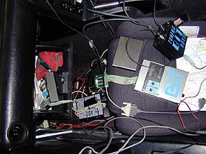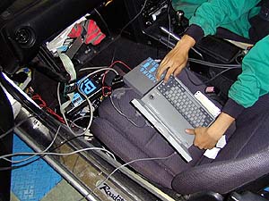 なんつー物々しい風景でしょ。そりゃもう大騒ぎ(笑)。接続されているのは、A/Fと点火時期と回転数をリアルタイムでモニタしながらログを採れるというAF640、某rs501謹製ROMチェンジャ、某リアルタイムROMエミュレータ、など。でもエアフロ付きシステムなら、こんな大袈裟なモンを使わなくても空燃比計が有ればセッティングは容易に出せるんだけどね(笑)。
