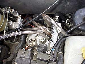 ↑名付けて「アイドルスピードコントロールエアディストリビュータ」である(笑)。多分、熱帯魚屋で買ってきた部品と思われる。ISCVを経由したエアパイプはこれで4つの独立したマニに分配される。ISCV本体はマニに付けるわけにいかないので、単体で適当な所にブラ下げてある。B6の場合、ワーモワックスバルブはインマニのサージタンク部分にボルトオンされる構造ゆえ、それを流用する事は出来なかったようで冷間アイドルアップはISCVのみに頼っている。従って、完全冷機時にはファストアイドルがイマイチうまく効かないので1000回転程度でボロボロとアイドルする。ま、止まらないみたいだから良いのでは?