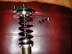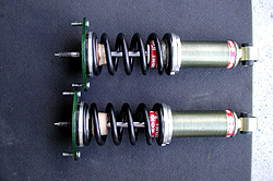 KONI-GPを永く使ってきた。だが、やはりノーマル形状故の限界が見えてきてしまう。3K程度のバネで走ってるウチは良かった。が、6Kgf/mmで200mm程度のバネになるとバネはかなり遊んでしまうし、それでもSタイヤでサーキットを走ると過激なロールが発生し、リヤアウト側の底突きによるリバースステアも出る。そもそも6K程度のバネでサーキットは辛い。だが、ノーマル形状のバネでそれ以上のバネレートはほとんどムリだ。KONI-GPでそれ以上を求めるのは酷ってモノだろう。やるならば、O/H&高レート対応の減衰力変更、ショートストローク加工、ショートケース加工、車高調アダプタ、ピロアッパ対応 or NBアッパ対応加工、をやらねばならん。そこまでやるならフルオーダの足を作って直巻バネにしようよ...(^_^;