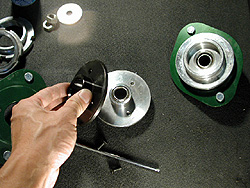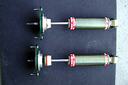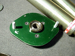 そのカラーを挟んで全長を伸ばしたのが下側、上はカラー無しで全長が短い状態だ。この意味はナニかと言うと、車高やバネを変更した時にプリロードを選べると言う事。通常ならば車高を10mm上げればプリロード10mmかかってしまう。ところが、10Kgf/mmクラスのバネでプリロード10mmってのは100Kgに相当する。ダンパ1本当たりの1G荷重は300Kgfくらいで、1Gで30mm程度しか縮まない。そこ10mmものプリロードを掛けたら足の伸び代は20mm程度になってしまうし、100Kgf以下の力では足は1mmも動かない。これではしなやかな足とは程遠いわけで、プリロードを掛ける訳にはいかない。が、バネが大きく遊んでいるなら別だが、普通は車高を上げればプリロードも掛かってしまう。そこでカラーを入れる事で全長を伸ばしてバネにプリロードを掛けずに車高を調整できるようにしたわけだ。これにより車高とプリロードを別々に調整出来るようになった。