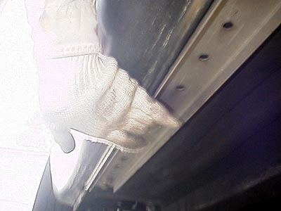 </余談>こうやって真ん中部分を手で押してみると、目で見て解かるくらいにグニョグニョと動く。片手の力で0.5mm〜1mmくらいの歪みは出ている。同じモノを付けている人は手で真ん中部分押して見てほしい。その頼りなさを実感して頂ける筈だ(笑)。何故そんなに簡単に動くかというと、この鉄板の取付け状態の酷さが原因である。フロアにナットを溶接してそれにボルト止めしてあるのだが、ナットはフロアからちょっと浮き上がっている。したがって、鉄板全体もフロアには密着していない。フルフローティングマウントになっているのだ。これでは....?