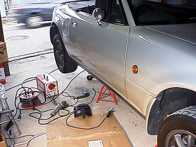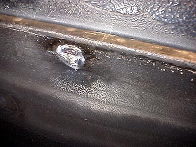 ちょっと解かりにくいけど、こんな感じ。12mmの穴を空け、棒ヤスリで少し広げる。フランジ付きナットを叩き込み、フランジ部分とフロアを電気溶接する。これを方側につき2個所、合計4個所やった。