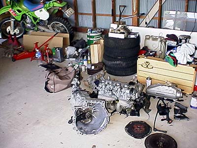 エンジン一基が在庫になった現在の私のガレージの片隅の怪しさ。ロドスタのミッション1基、B6が1基分、B6のインマニ、フライホイール、クラッチ1式、AE101の4連スロットル、タコアシやマフラー、足回りパーツなど怪しげな部品が散乱しているのだった(笑)。