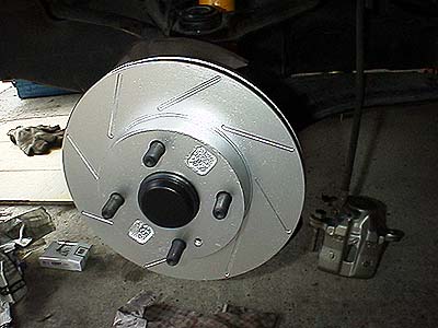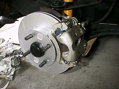 組み付けたスリット入りローター。サビサビになるのが嫌なのであらかじめ耐熱シルバーに塗装しておいたモノ。もちろんパッドが当たる面の塗装は踏めば奇麗に剥げる。