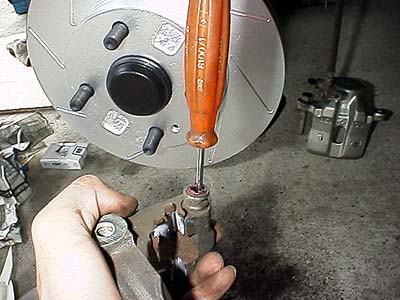 スライドピンが入る穴の方にもチューブ入りのラバーグリスを塗ってやる。細いマイナスドライバなどが便利。あとはそれぞれの部品を組み付けてやれば良い。各ボルトのネジ山には二硫化モリブデンを塗っておこう。キャリパーをはめる時に各ブーツを挟んで切ってしまう事が良くあるので気を付けてほしい。フロントブレーキの上側スライドピンのブーツははまったように見えてきとんとはまってない事が多い。スライドピンをねじ込んで締めただけでははまらないようだ。キチンとはまってないとスライドピンが錆びるのできちんとはまった事を確信してほしい。
