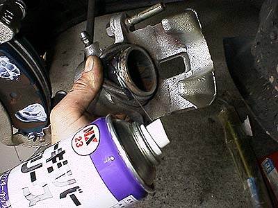 ピストンのブーツをめくってフルードの漏れやにじみ、ピストン表面の錆などの有無を点検する。錆びているようならそのままピストンを戻してはいけない。漏れがある場合も同様。どちらの場合でもキャリパーをO/Hする必要が有る。錆びているものをそのまま戻すとブレーキフルードの漏れや片効き、引き摺りなどの問題になるので絶対に止めよう。問題がなければ写真のようにラバーグリスをたっぷりとスプレーしてやる。それからピストンを戻してほしい。なお、スプレー式のグリスはしばらくガスが出るのでブーツが膨らんでしまう。組み付ける前にブーツ内に溜まったガスを抜いてやろう。