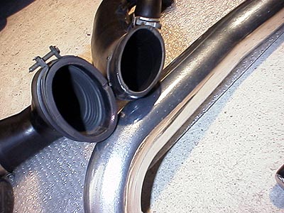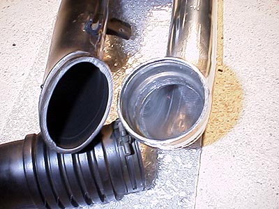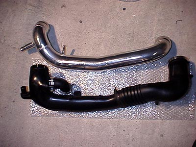 ↑純正パイプとクスコのパイプの比較。ウニウニと曲がっている上に、太さが一定ではない純正品はいかにも効率が悪そう。クスコのモノは一定の太さと緩やかな曲がりを描く。出来は結構良い。ちなみに表面の仕上げは写真で見るより悪い。バフ掛けってほどでもない。内側は溶接の段差も修正してあって結構真面目な作り。本体はアルミ押出しパイプみたいだが、小さいホースを挿すところは削り出しのパイプを溶接してある。このパイプ部分は根元の厚みが確保してあり、強度に心配はない。結構手間がかかる加工をやってますね。