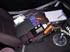 空燃比計、オシロスコープ兼デジタルマルチメータ、512KB表示のマップアクセスモニタ、などを接続してのテスト走行。久しブリに椅子を付けたのだが、この翌日外すハメに...(^^;。エアフロ電圧をデジタルマルチメータで計測、2速全開加速中にデジタルマルチメータのHold機能を使って表示を固定させ、その数値を記録した。7000rpmと5000rpmで計測。バラツキが有るようならサンプル数を増やしてデータ精度を上げようと思ったが、やってみたら意外と正確でバラツキはほとんど出なかった。という事で、7000rpmは3回、5000rpmは5回計測した。