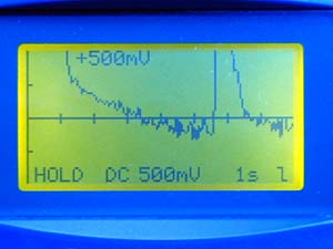 1速で1000回転くらいから全開加速で8000rpmまで引っ張り2速にシフトアップするまでのエアフロ電圧変化のログを採ったのでそれも見て頂きたい。画面の左端の方は電圧が高すぎて画面からハミ出している。波形が画面に入ってきた辺りが2000回転くらいの時である。画面右の方で再び波形が画面からハミ出しているが、これはシフトアップの瞬間のアクセルオフで、ここが約8000回転。その更に右側が2速全開である。グラフの縦軸は1目盛りで500mV、横軸目盛りは1秒である。縦軸は全体的に500mVのオフセットを付けている為、真ん中の水平線がちょうど500mVになる。