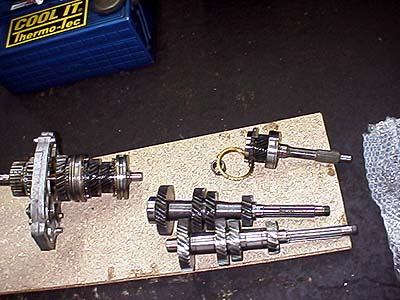 するとメインシャフトは全部抜かなくてもある程度抜くとカウンターシャフトが先に外れる。カウンターシャフトが抜けるとメインドライブシャフトと4速のシンクロナイザーも抜ける。右上がメインドライブシャフトだ。こいつにクラッチディスクがはまるわけ。真ん中上がデフォルトのカウンターーギヤ、下はHKSのクロス。