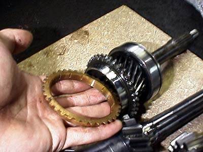 ちとピンボケだがこいつがシンクロナイザーリングだ。内側に溝が切ってあってオイルの油膜を切るようになっている。私の中指の先辺りに有る見えるのがシンクロナイザーコーン(銀色に光っている部分)だ。シンクロナイザーリングはこのシンクロナイザーコーンの表面との摩擦力によって相対的に速度差があるギヤ同士にブレーキをかけて相対速度をゼロにする事でシンクロさせるのだ。だからこの部分の摩擦力は可能な限り高い方が良いのだ。くだらん添加剤なんか入れるのはやめよう(笑)。