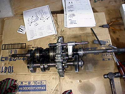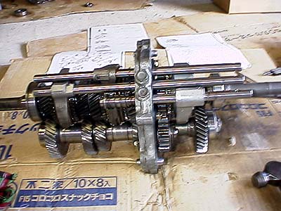 5速&リバースのシフトフォークとシフトロッドを組み付ける。実は3本のシフトフォークがどれがどれだかさっぱり解からなくなって随分悩んだ(^^;;;。