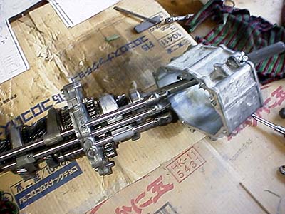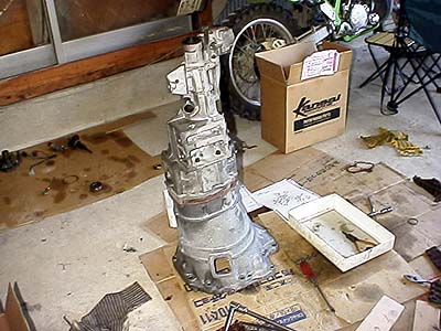 各合わせ面に液体パッキンを塗って組み付ける。フロントハウジングとエクステンションハウジングとインターミディエイトハウジングをセンターハウジングにまとめて付けるわけ。すべてのハウジングがサンドイッチになるようにして締め付けてある。実はリヤエクステンションハウジングはヒビが入っているので現車に付いているミッションと2個一にしなければならない。液体パッキンを乾燥させるまでの仮組というわけ。現車に付いているミッションを降ろしたらバラしてエクステンションハウジングだけ付け替えれば完全に完成となる。とりあえず仮完成って事だね。あとは載せ替えだな!