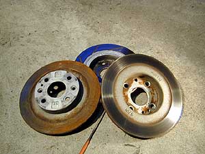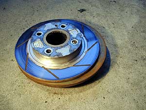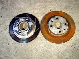 写真左がNA6CE用スリット入りど〜だロータ。右がサビサビに錆びたNB8C純正ロータ。外径は確か220mmの250mm。