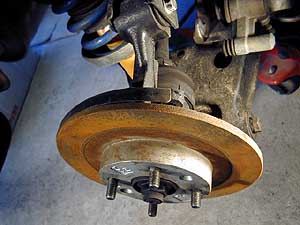 NB8のブレーキロータをそのまま付けてみると、バックプレートに見事に干渉する。ちょうどバックプレートと同じ大きさくらいで、入りそうで入らない。無理矢理入れても意味ないんだけど(^^;