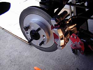 完成! 左が1600用、右が1800用。真ん中のハブの大きさは同じわけで、ロータが大きくなった分だけパッドが外側に行ってるのが解かるかと思う。1600用はバックプレートよりかなり小さいが、1800用はバックプレートとほぼ同じ大きさ。ちなみに1800用とNA6CE用のブレーキシテムの違いは、リヤはロータが大きくなってパッドが外側にいっただけでキャリパは同じ部品。フロントはロータもキャリパも全部違う。パッド面積はかなり大きいし、ロータもかなり大きい。Pバルブの特性が変更されているのだが、これはリヤに比べてフロントの能力アップが大きかったのでバランス修正の為だと思われる。マスタシリンダそのものは変ってないようだ。ブースタの倍力比が大きくなっているようで、1800のカックンブレーキの秘密はブースタの強化とフロントブレーキの大幅な容量アップにあるようだ。リヤブレーキは1600用と比較してそれほど大きな違いはないようで、私の場合、1800用ブレーキをリヤだけに付けたわけだが、特に違和感は感じない。