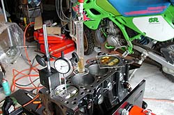燃焼室容積に近い50ccのモノ。最小目盛りは0.1ccだ。これを燃焼室代わりに使って各方法の測定誤差や再現性を実験しようと思った。メスシリンダの目盛りを見ないようにして、注射器やピペットの目盛りを使って50ccの液体を注入しようと思ったのだ。が、どの道具を使ってもエキサイティングな誤差が発生した(^^;; 50cc入れたつもりなのに47ccしか入ってなかったり、50ccを超えてみたり。こんなんでは圧縮比の測定や燃焼室容積合わせなんか出来るわけがない。注射器やピペットの目盛りはまったく当てにならないのだ。そして、ふと思った。逆にやれば良いじゃんっ! 予めメスシリンダに50ccの液体を用意し、そこからこぼさないように燃焼室に移す。燃焼室がいっぱいになった時点でメスシリンダ側に残った液体の量を測定して引き算すれば燃焼室容積が出るじゃないか! これを試したところ、測定再現性がかなり高く、明白にこぼしたとか失敗したと解る時以外はピッタリと同じ計測値が出たのだ!