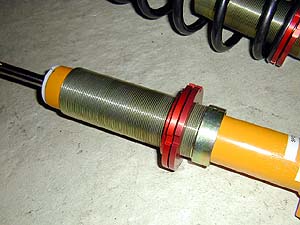 これだ。ネジ車高調整式でスプリングもセットになってる。減衰力は従来通りの無段階調整式で、データシートによれば最大減衰力だとノーマル比で200%まで固まるとの事(だとしたらGPと同じだね)。スプリングは最後の一巻きだけがテーパ状に絞られているが、バリアブルレートってわけじゃなくてス小径プリングシートに合わせただけだろう。スプリングシートが小径になっているのは、ドライブシャフトとの干渉を避けて自由長の長いスプリングでも車高調整幅を確保する為か?ケースの形状や寸法は旧型KONIと同じでBILSTEINに比べるとケースが短い。更に今回の新型はロッド長も短くなっている。スプリングレートはフロントが4K強、リヤが3K強らしい。スプリングシートを下の方にセットすると僅かにイニシアルがかかる程度となる自由長だ。イニシアルの強さはスプリングコンプレッサ無しで組めそうな程度。4K-3K程度のスプリングに伸び側重視の減衰力設定+幅の広い無段階減衰力調整、加えて自由で幅が広い車高調整。これはストリート〜ミニサーキットで最高の足になるんじゃないかな?