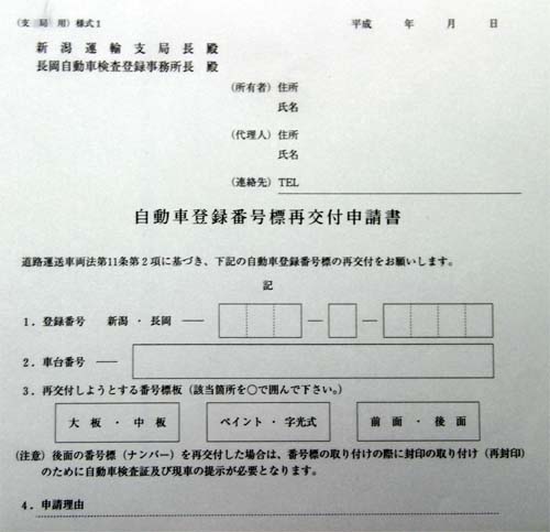 申請理由これだけ。これをその場で書いて、検査証のコピーと共に提出。5日後にはナンバーが生産されて準備完了。申請の有効期間が1ヶ月なので、5日後以降で1ヶ月以内に破損したナンバープレートと750円を持って行くと、新しいナンバをくれる。尚、旧ナンバープレートを紛失してしまった場合などは話しが面倒になるらしいが詳しくは知らない(^^;