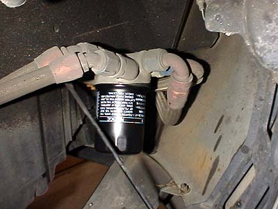 オイルエレメントは右フェンダー内側前方に移動される。このオイルブロックにサーモスタットが内蔵されている。エンジン側から来たオイルはフィルターを通ったあとで、サーモが閉じていればオイルクーラーコアへ行かずにそのままエンジン側に戻る。サーモスタットが開くとコアに向かって流れ、コアを通ってからエンジンに戻る。このオイルブロックには各種のメーターセンサーを取付け出来るようになっている。大盛りの電子式油温計のセンサーは付けられるが機械式はセンサーが太いので取付け出来ない。センサーの穴は2個か3個付いているので油圧計と油温計の同時取付けも可。 こいつに使うオイルエレメントはトヨタのA型エンジン用だ。私は4A-G用のちょっと大きなタイプを使っている。品番は90915-10002だ。