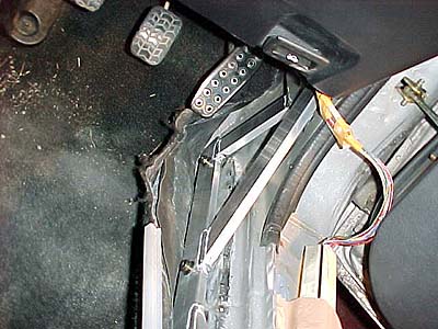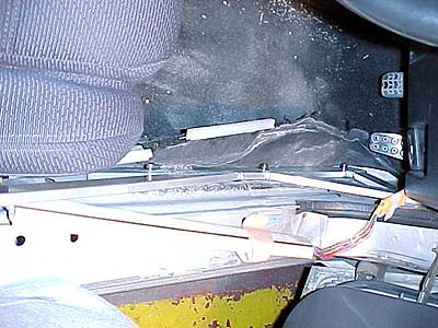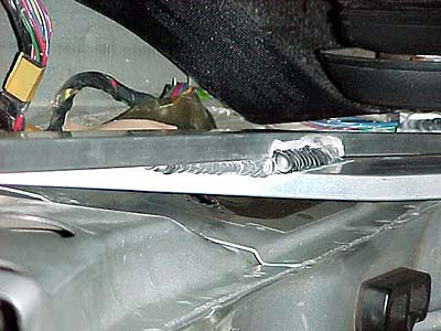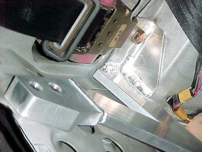 斜めバーの後ろ側を上から見た図。縦方向のバーに溶接しちゃいました。縦のバーは上側がハードトップ固定用のボルト穴に固定。下はシートレールと共締め。