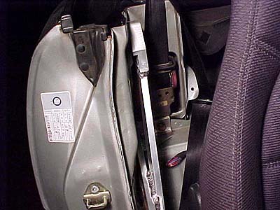 斜めバーと縦バーの位置関係。縦バーはガッチリとしたブラケットでボディ側にボルト止め。斜めバーは縦バーに溶接されているだけでなくそのまま後ろまで伸びてシートベルトのリトラクタと共締めでボディ側に固定される。